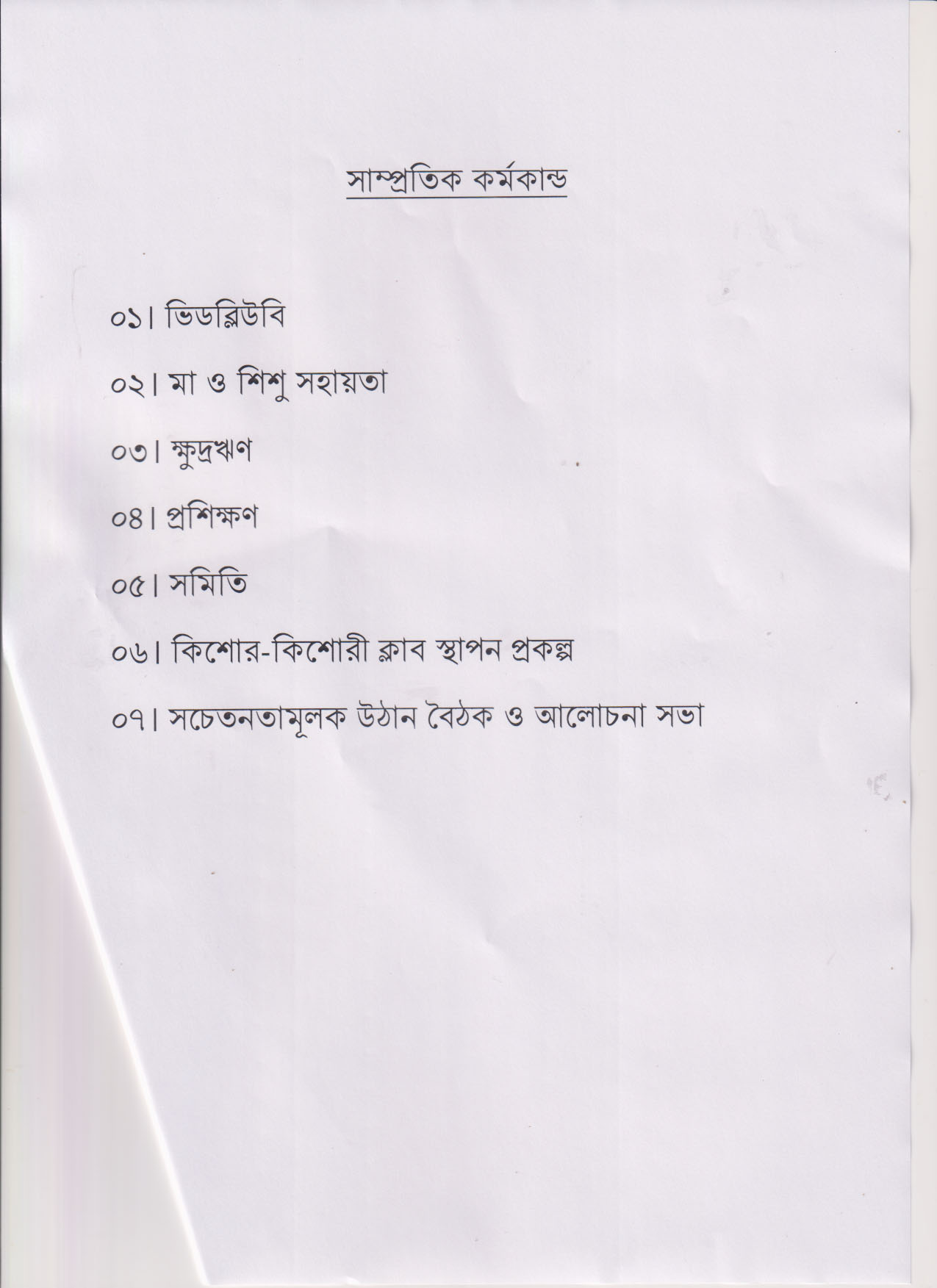 ভিডব্লিউবি উপকারভোগী ২৫৫৮ জন, মা ও শিশু সহায়তা কর্মসূচি প্রতি মাসে অনুমোদন দেওয়া হয়, ক্ষুদ্রঋণ প্রদান, কিশোর-কিশোরী ক্লাব স্থাপন প্রকল্প, স্বেচ্ছাসেবী মহিলা সমিতির মধ্যে অনুদান প্রদান এছাড়াও বাল্যবিবাহ প্রতিরোধ, নারী ও শিশু নির্যাতন প্রতিরোধ, শিশু শ্রম, মানব পাচার ইত্যাদি এর উঠান বৈঠক ও আলোচনা সভা করা হয়